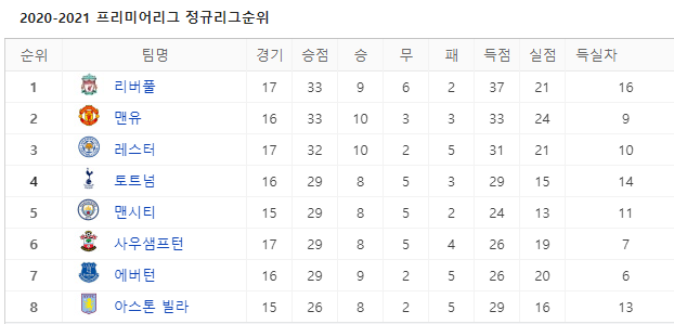 한때 1위를 달리다가 리버풀에게 패배하고 주춤했어요.