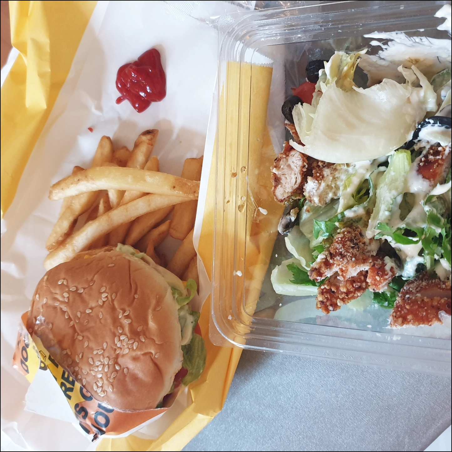 NBB 시그니쳐 세트 하나와 버거 하나 시저 샐러드 하나를 포장했습니다.