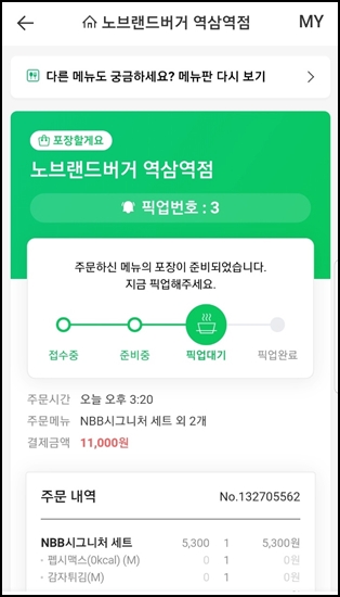 역삼역 노브랜드 버거에 도착해서 픽업 번호를 보여주면 주문 음식을 줍니다.
