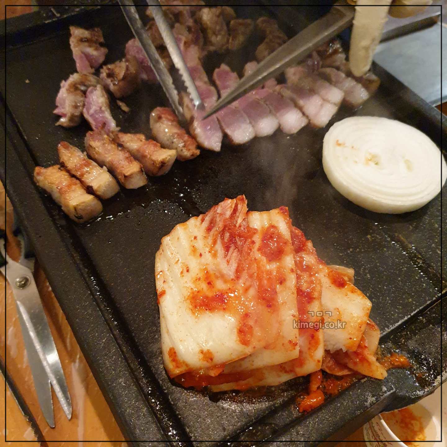 타이밍 맞춰서 김치와 양파도 올려줍니다.