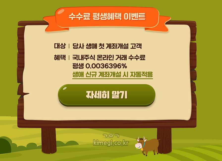 국내 주식 온라인 거래 수수료가 평생 0.0036396%입니다.생에 신규 계좌 개설 시 자동 적용됩니다.