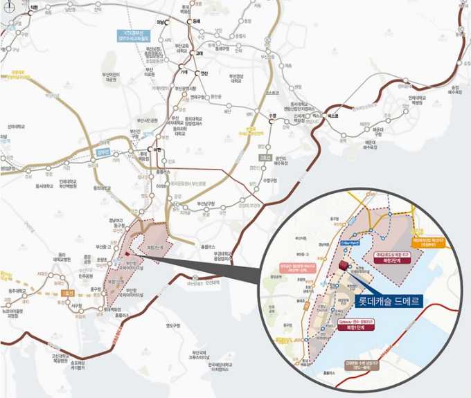 부산역 바로 옆 북항 재개발 구역에 위치한 롯데캐슬 드 메르입니다.