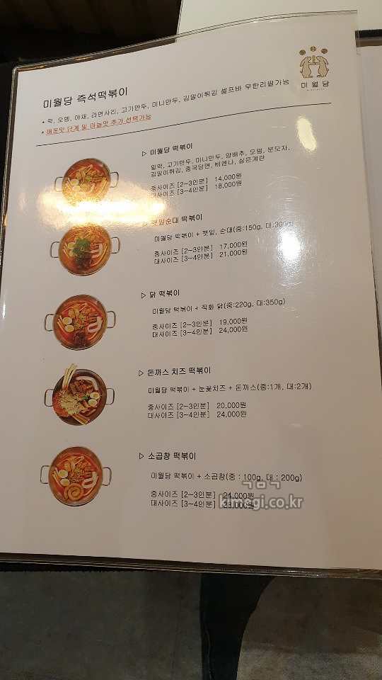 기본 떡볶이부터 닭, 순대, 돈가스, 곱창 떡볶이가 있습니다.