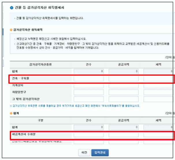 입력 서식으로 넘어오면 시스템에서 자동으로 여러 항목을 체크해 놓습니다. 추가적으로 빨간색으로 칸을 쳐 놓은 "건물 등 감가상각자산 취득 명세서"를 선택해 주세요.