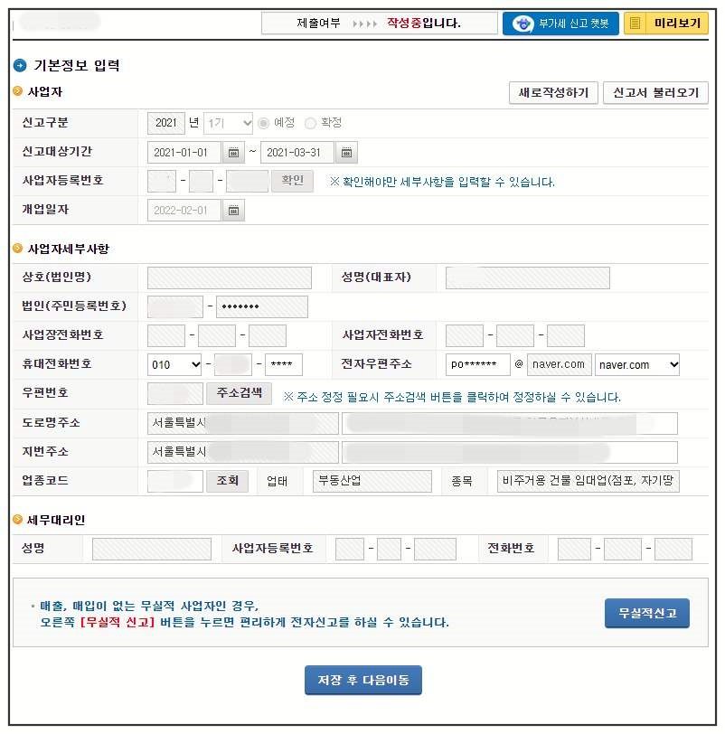본인의 일반 임대사업자 사업자 번호를 입력하면 세부사항은 자동적으로 입력됩니다. 자동 입력되지 않은 항목만 추가적으로 입력한 다음 저장 후 다음으로 이동합니다.