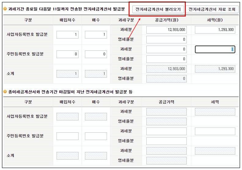 클릭하시면 아래 화면으로 이동됩니다. 오른쪽 상단에 있는 "전자세금계산서 불러오기"를 클릭합니다. 그러면 자동적으로 본인의 공급가액과 세액이 산출됩니다. 자동으로 전자세금계산서가 산출되지 않으신 분들은 직접 본인의 세금계산서를 확인 후 입력해 주시면 됩니다.