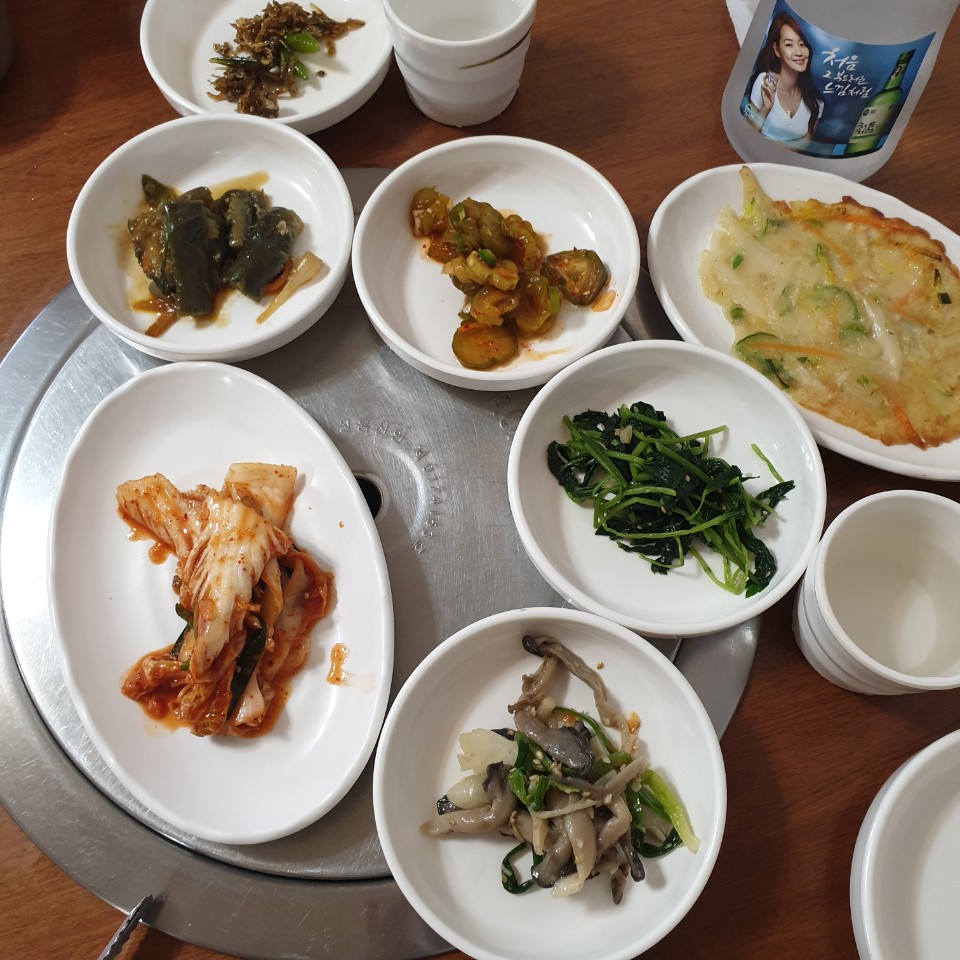 부침개부터, 가지볶음, 오이지, 멸치, 나물, 김치, 버섯볶음 등 반찬이 정말 많습니다.