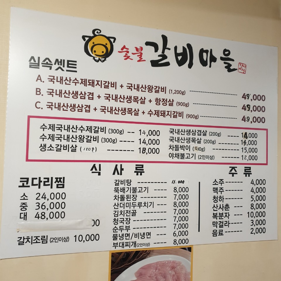 불광역 맛집 숯불 갈비마을 메뉴판입니다.
