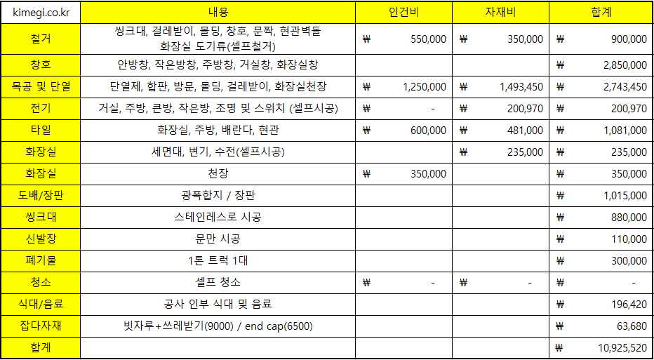 이렇게 단점이 많은데 반셀프 인테리어를 하는 이유는 바로 금액입니다. 이렇게 스트레스받는 일을 대신해주기 때문에 인테리어 업체가 많은 수수료를 때 가는 거더라고요. 아마 본인의 자재를 대량 구매하고 주변에 연결된 인맥이 있어서 공사비에서도 더 가져가긴 할 거예요. 2달 동안 고생해서 800만 원 정도 인테리어비를 절감했고 나름 새로운 경험을 해본 것 같습니다. 아래에 반셀프 인테리어를 하면서 들었던 자세한 비용 내역입니다.