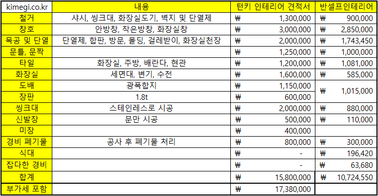 16평 노후 빌라 기준으로 턴키를 하였을 때 나온 견적과 직접 반셀프 인테리어를 하면서 발생한 견적을 비교해보겠습니다. 지난번 prologue에서 이야기했듯이 이 집의 목적은 결국 재개발 투자이기 때문에 최대한 저렴한 자재로 합리적인 인테리어를 하려고 했기 때문에 저렴하게 견적을 받을 수 있었습니다. 견적은 비교해서 아래 표로 정리해 보았습니다.