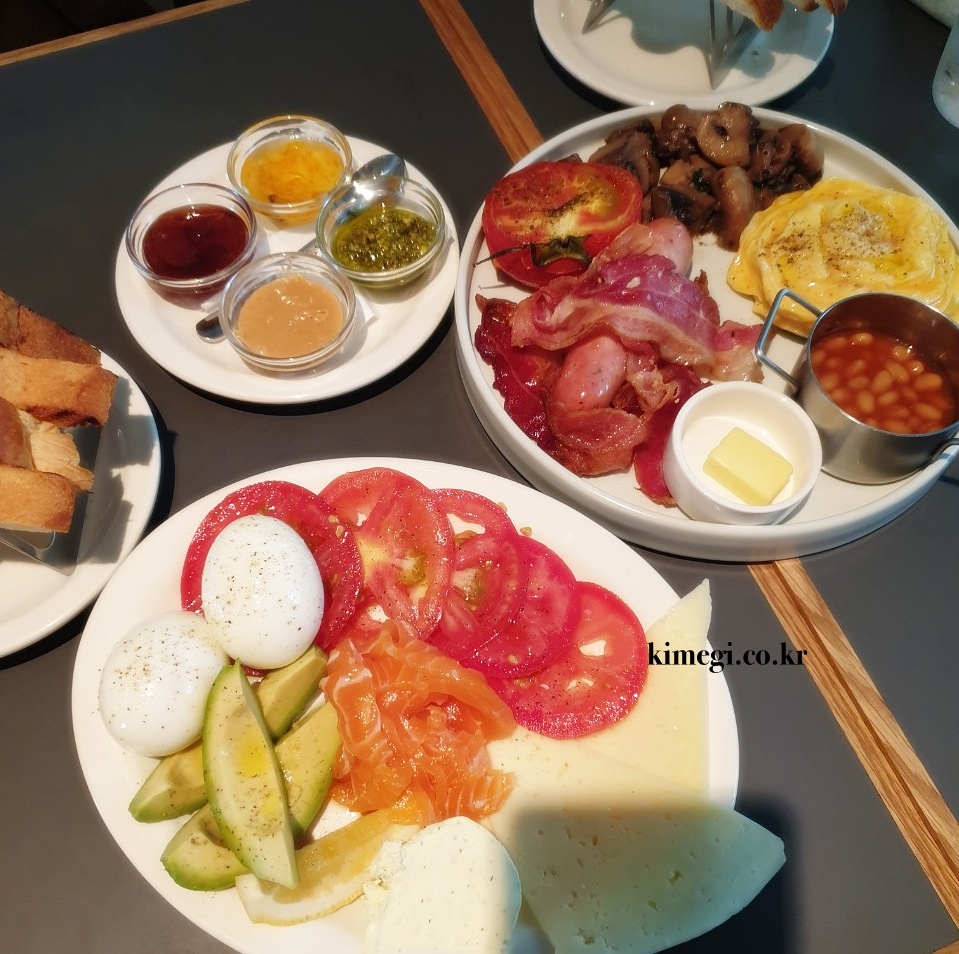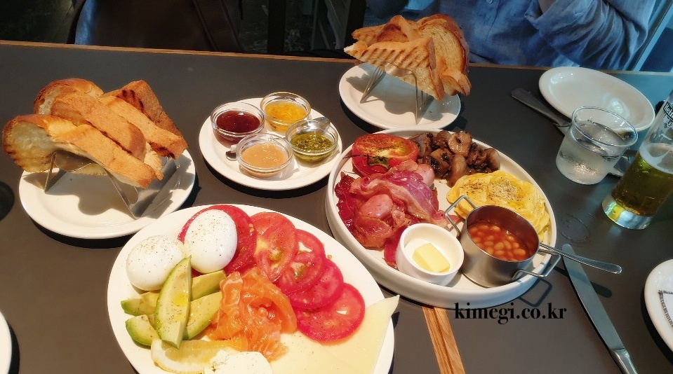 토스트에 소스와 버터를 바르고 먹고 싶은 것을 올려먹으니 딱 호텔에서 먹는 조식 같았어요. 분위기도 좋아서 휴양지에 놀러 온 그런 기분이었습니다. 여행을 안 간 지 오래 됐는데 여행 온 느낌을 느낄 수 있더라고요.