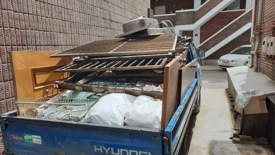 공사 첫날 8시 30분부터 진행하기로 했는데 제가 늦잠을 자버렸습니다. 저는 무음을 하고 자기 때문에 전화도 못 받고 철거 아저씨들 그냥 가려고 했대요. 마침 공사하면서 다음날 공사할 창호를 미리 옮겨놓기로 해서 창호 사장님이 말려주었대요. 제가 1시간 뒤에 일어나서 비밀번호를 알려준 뒤 후다닥 달려갔습니다. 이분들은 시간이 금인데 너무 죄송하더라고요. 도착했을 때는 이미 트럭이 이렇게 쌓여있었어요.