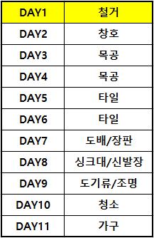 저희 집 인테리어의 기본 원칙은 가성비 이기 때문에 쓸모없는 공정을 빼고 아래 스케줄로 진행을 했습니다. 오늘은 반셀프 인테리어 첫 번째 철거공사 리뷰입니다.