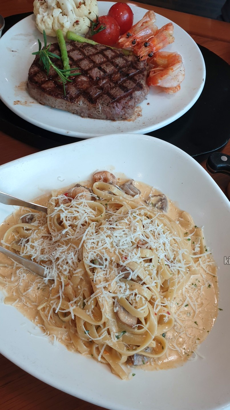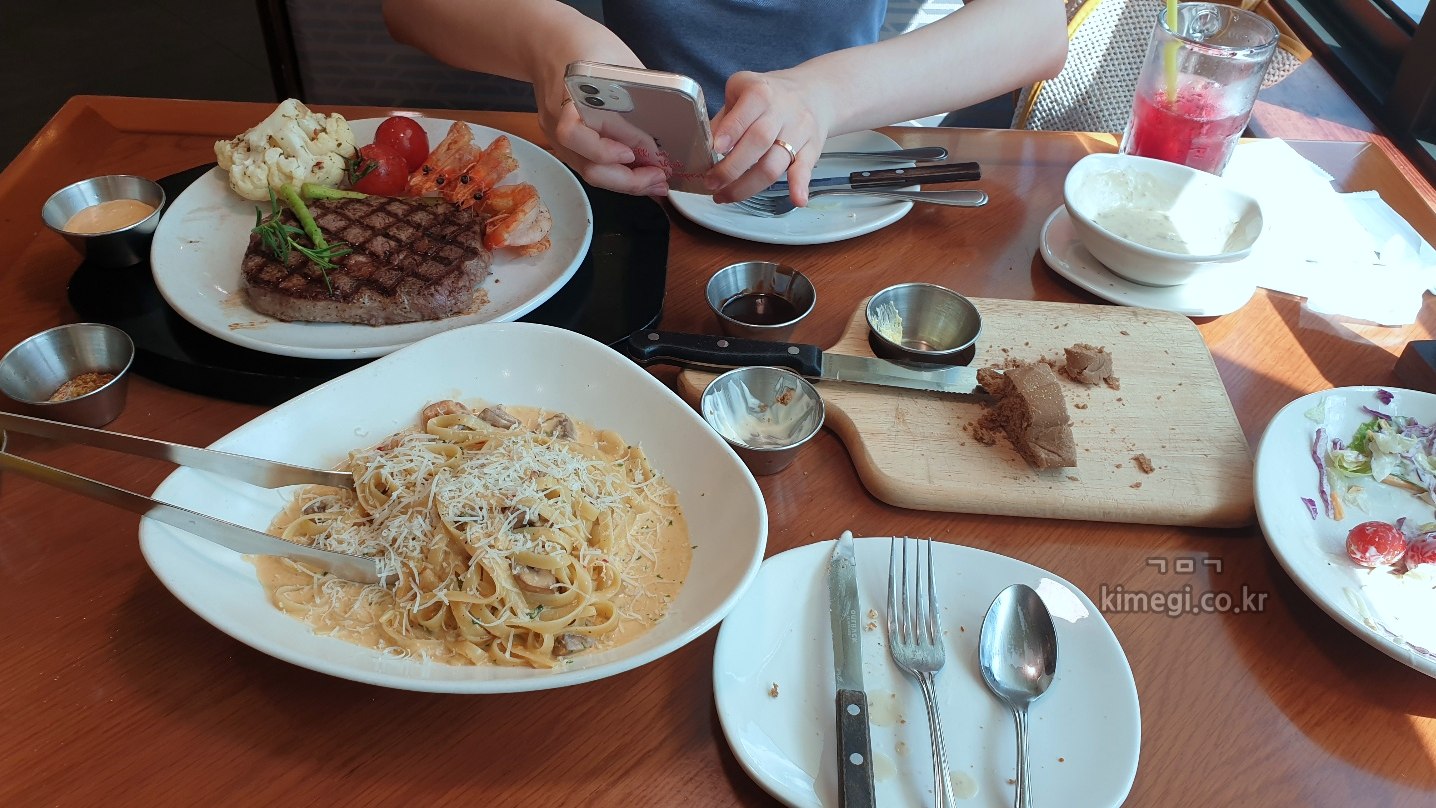 샐러드와 식전 빵을 먹다 보면 메인 메뉴가 나옵니다. 꽃등심 스테이크와 투움바 파스타를 주문했어요. 아웃백 하면 투움바 파스타입니다.