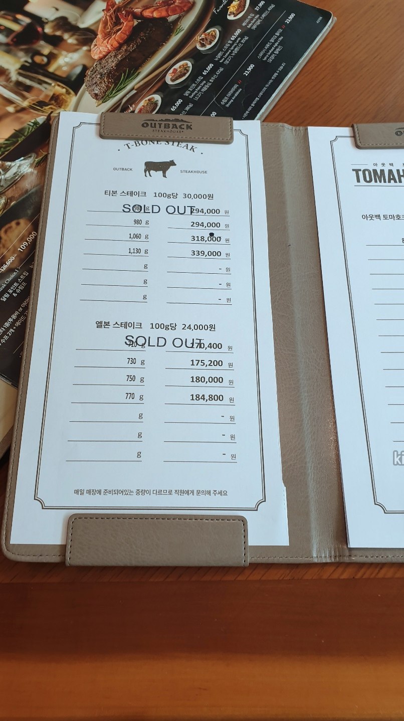 아웃백 메뉴판입니다. 요즘 토마호크 스테이트가 핫하더라고요. 아웃백 토마호크 스테이크는 100g 당 22,000원의 가격입니다. 티본스테이크는 100g당 30,000원입니다.
