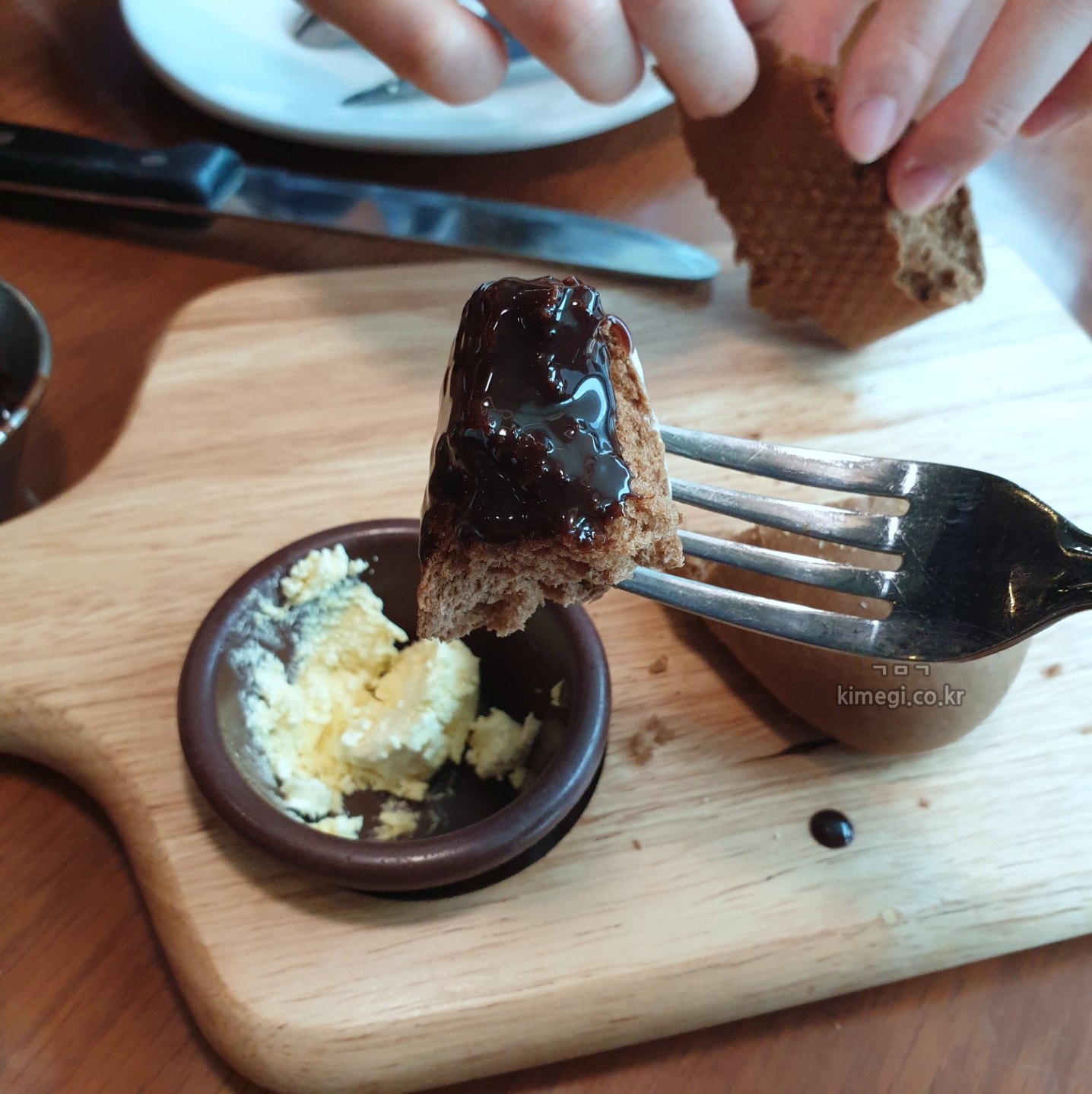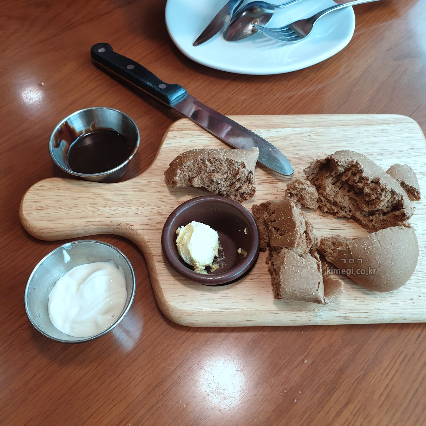 아웃백을 가는 가장 큰 이유는 이 식전 빵 부쉬맨 브레드 때문입니다. 식전 빵이 정말 너무 맛있습니다. 메인을 먹기 전에 빵으로 배를 채울 정도예요. 신전 빵이 나오면 기본으로 버터가 나오는데 초코시럽과 블루치즈 소스를 달라고 하면 추가로 줍니다. 이 블루치즈 소스가 진짜 맛있습니다.