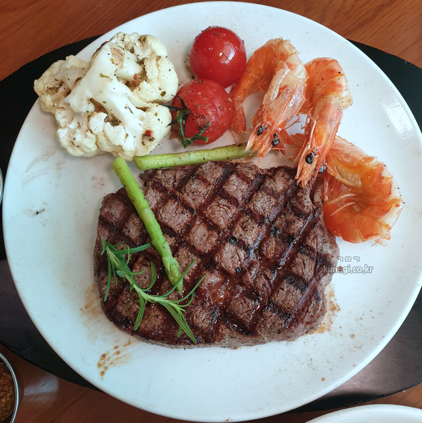 메인인 꽃등심 스테이크입니다. 스테이크는 비주얼과 소리로 먹는 것 같아요. 뜨거운 접시에 나왔을 때 그 지글지글한 소리가 너무 맛있습니다.