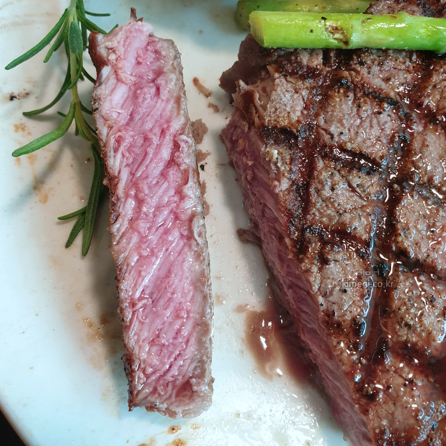 소고기는 자주 구워서 먹지만 이렇게 스테이크를 먹는 일은 자주 없는 것 같아요. 오븐 없이 집에서 만들어 먹기도 쉽지 않고 그릴 자국을 만들기가 쉽지 않죠. 그릴 자국이 뭐라고 더 맛있게 보이는지 모르겠네요.