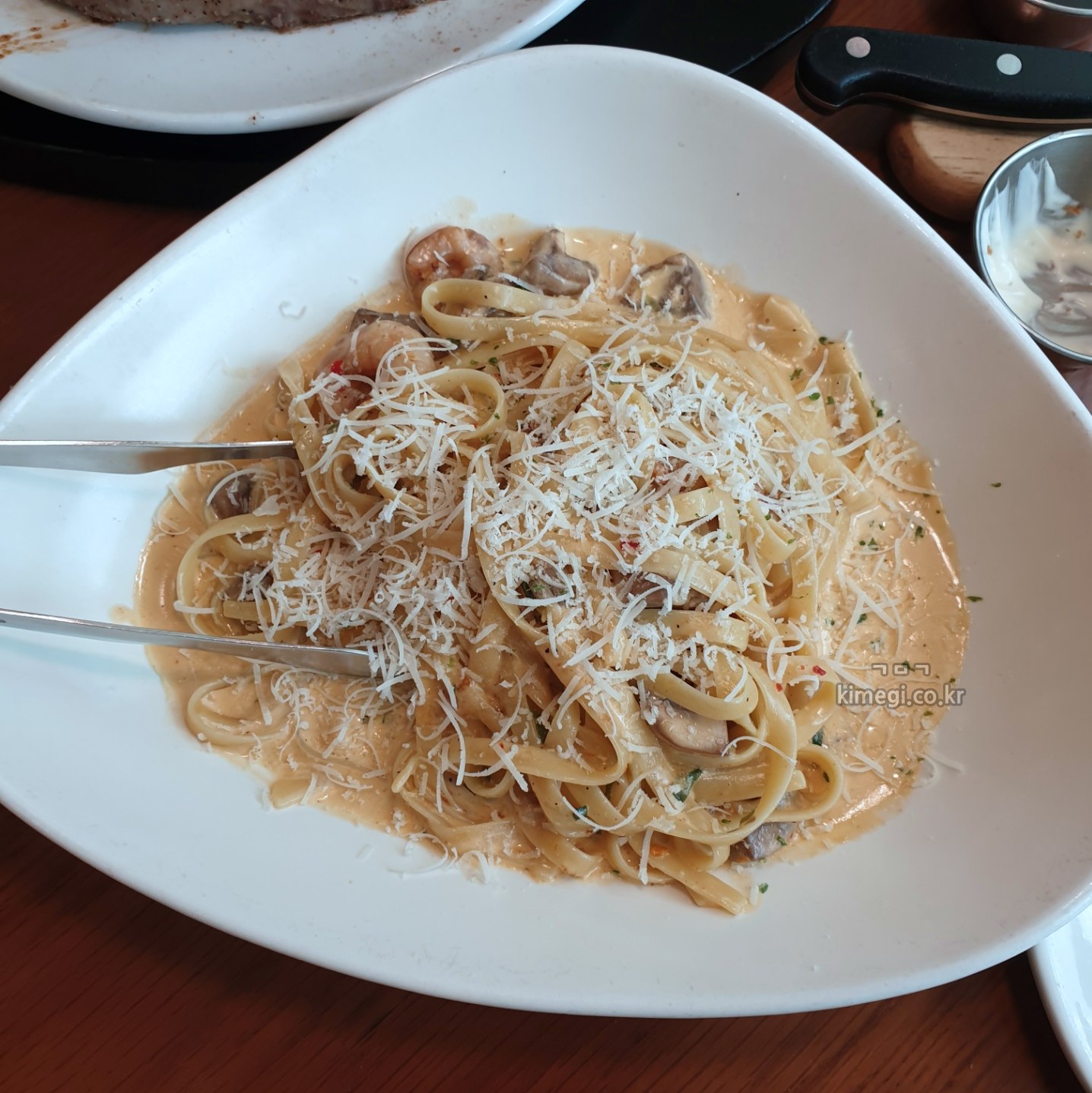 아마 아웃백에 방문해서 파스타를 고르라면 10에 9는 투움바 파스타를 먹을 정도로 가장 인기 있는 메뉴입니다. 꾸덕꾸덕한 크림이 정말 맛있습니다. 크림소스를 추가하면 더 주기도 하고 처음 주문할 때 많이 달라고 해도 됩니다.