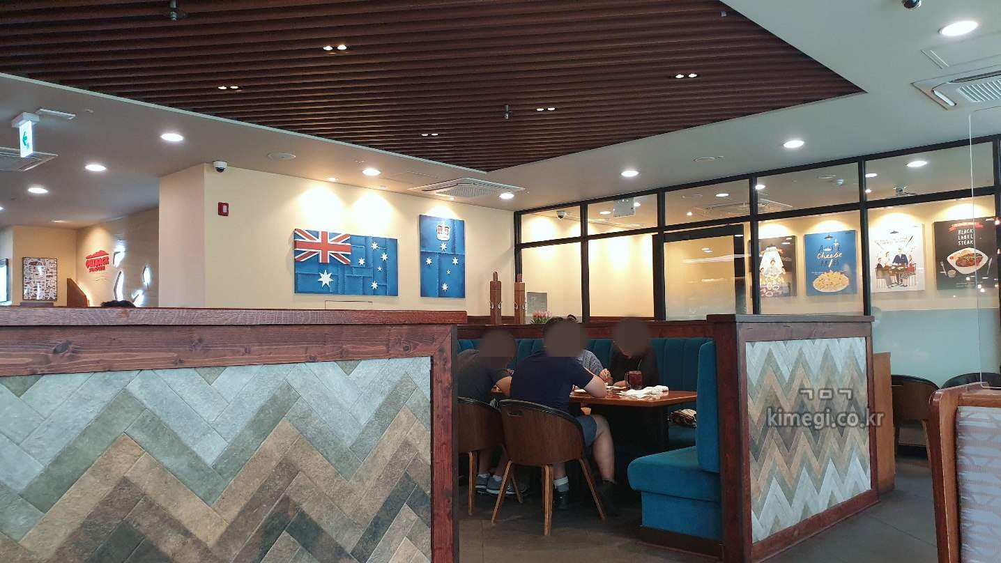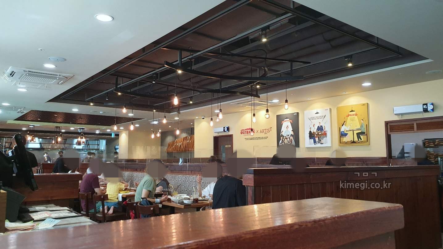 앞에 5팀이 대기하고 있었고 20분 정도 기다렸다가 입장 가능했습니다. 홀이 넓어서 순번이 빨리 빠지는 느낌이었어요. 아웃백 실내 분위기는 여전히 고급스러웠습니다.