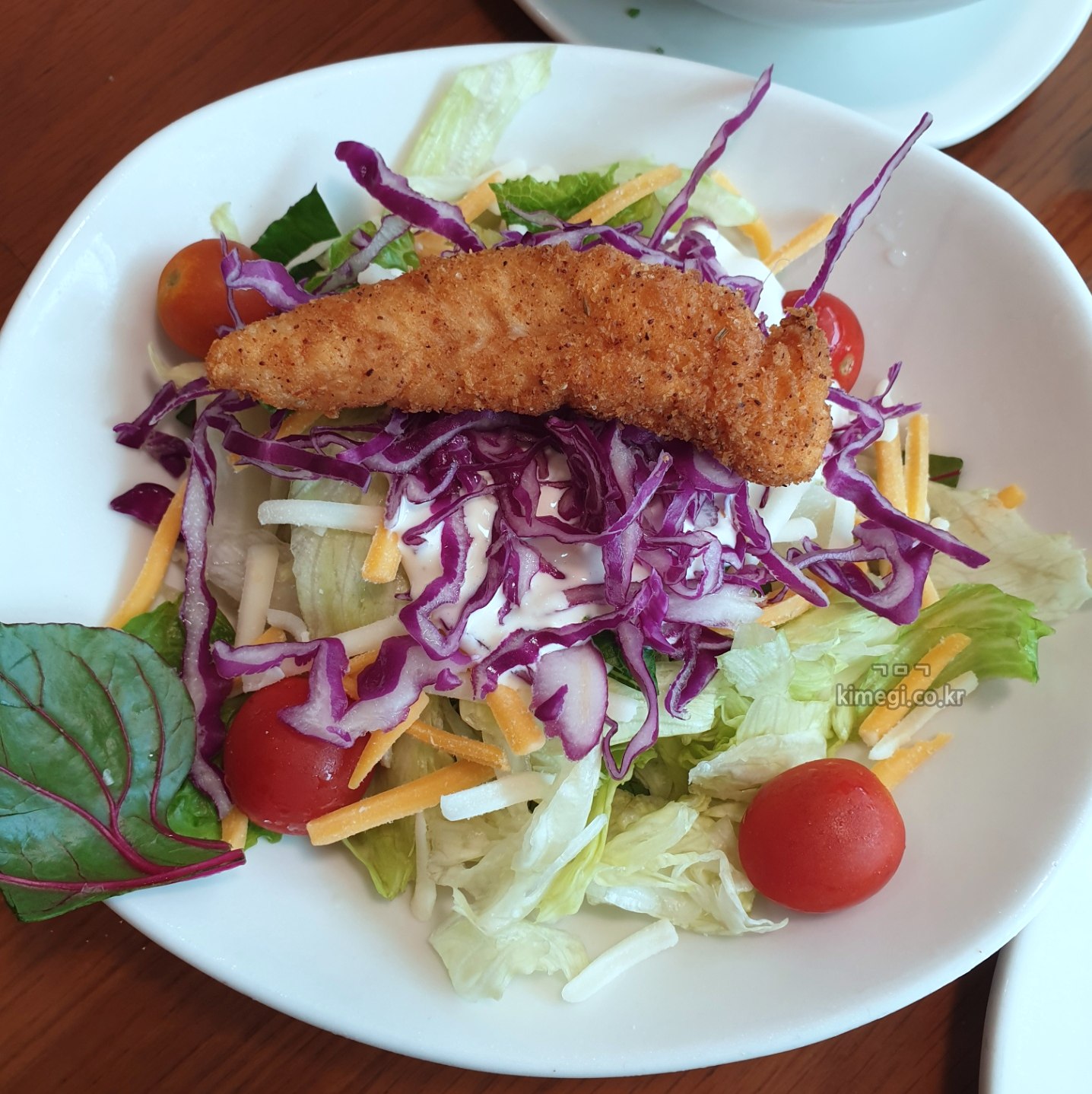 수프를 샐러드로 바꾸고 치킨텐더를 추가했습니다. 배가 부를 것 같아 맛만 보려고 치킨텐더 1개만 주문했어요. 물론 샐러드는 추가 요금 1,400원 치킨 핑거는 2,900원입니다. 솔직히 2,900원 내고 먹을 정도는 아닌 것 같아요.