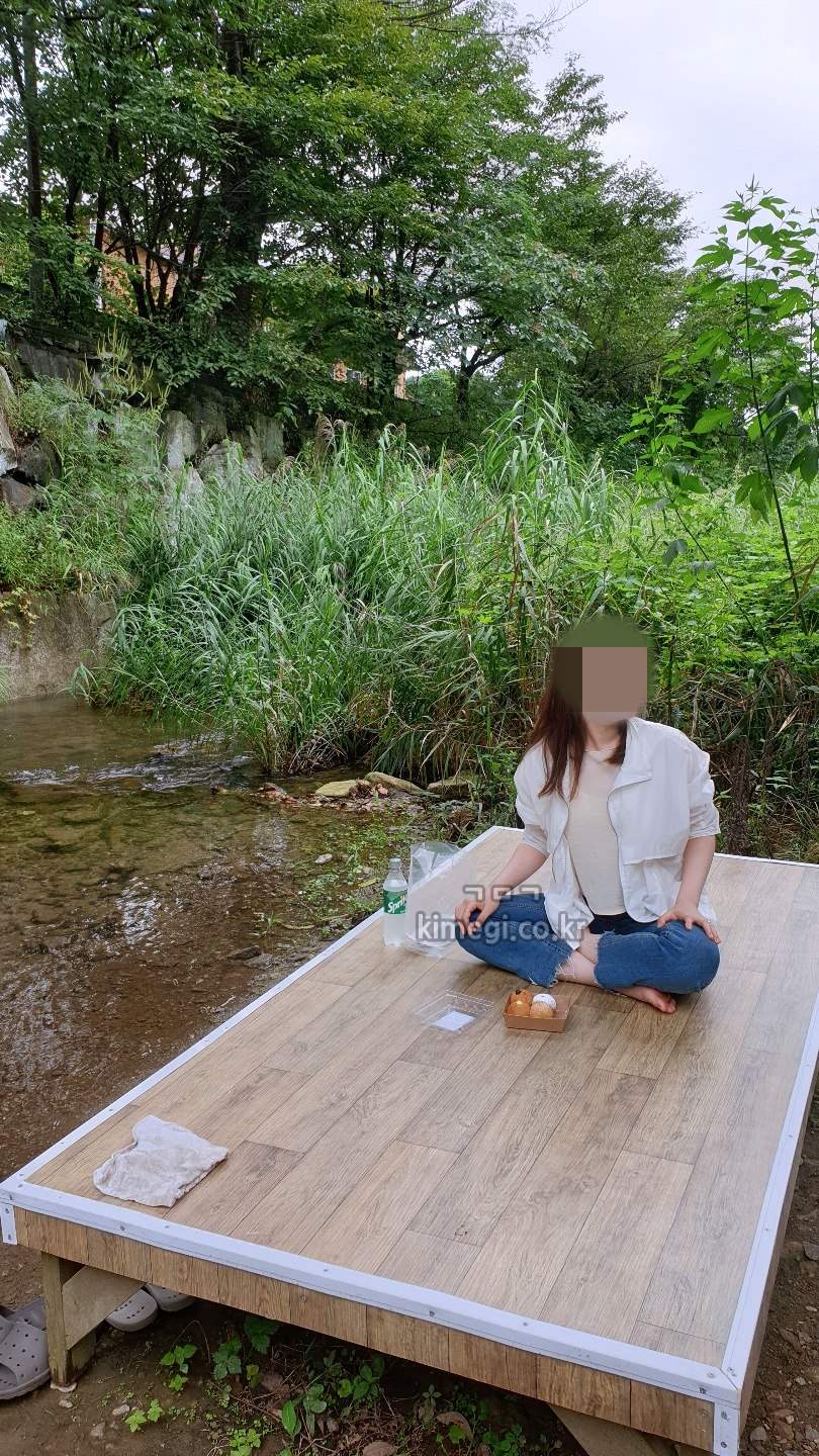 포천 이뉴펜션 앞에는 계곡이 있어서 시원하게 피서를 즐길 수 있어요. 입실 시간보다 조금 일찍 도착해서 계곡 앞 평상에 앉아서 빵 먹으면서 조금 쉬었어요. 동이는 계곡 위에까지는 따라오다가 아래로는 안 내려오더라고요. 본인 영역이 아닌지 위에서 놀어달라고 자꾸 부르더라고요.