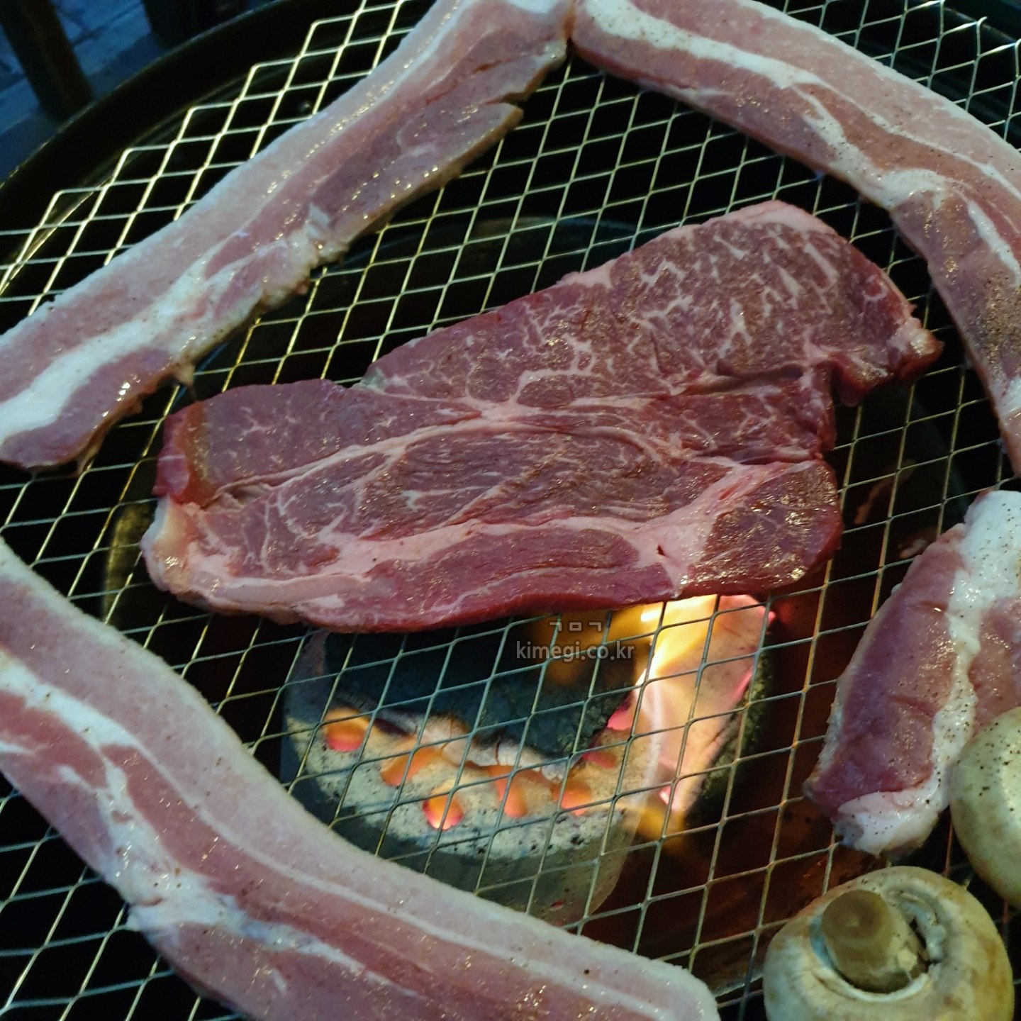 기름이 떨어지는 삼겹살은 가생이에 두어서 천천히 익히고 소고기부터 먼저 구워주었습니다.