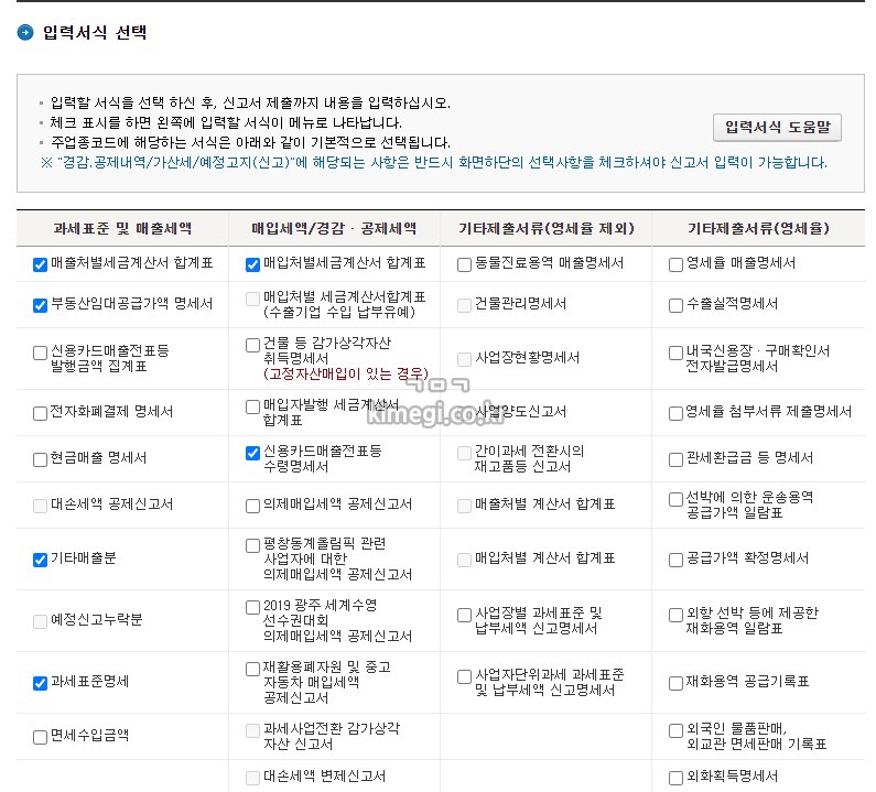 입력 서식으로 넘어오면 기본적으로 입력해야 할 항목들이 체크되어 있습니다. 그냥 선택되어 있는 대로 저장하고 다음으로 넘어갑니다. 매입처별 세금계산서는 필수로 체크해 주셔야 합니다.