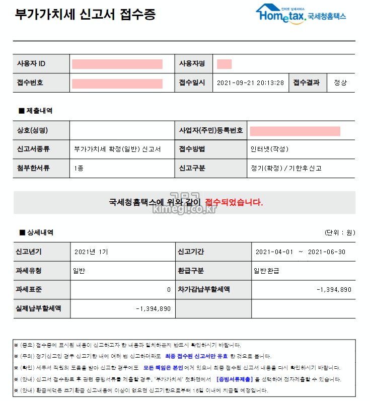 계좌가 입력 완료되면 접수증이 나옵니다. 1달이 안돼서 아래 환급될 세금이 기입한 통장으로 환급됩니다. 나중에 임대사업자를 폐업하게 되면 다시 반납해야 할 돈인 점 참고하세요.