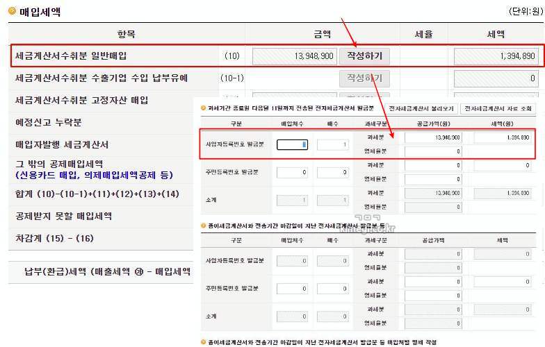 매출은 없으니까 매입세액만 입력하면 됩니다. 작성하기를 누르고 오피스텔 건물분 가격을 작성해주면 됩니다. 토지분이 아닌 건물분 매입 가격을 입력해 주면 됩니다.