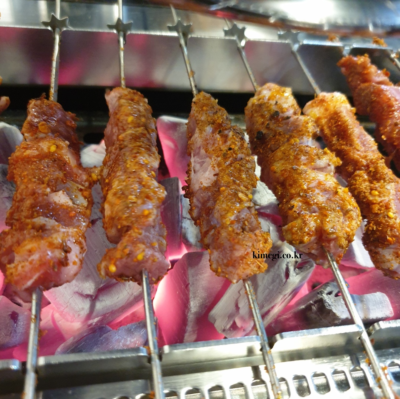 양꼬치를 굽는 불이 들어오면 이렇게 틀에 맞춰서 양꼬치를 끼워줍니다. 불판이 저절로 움직이면서 노릇노릇하게 구워주는데 침이 고입니다. 고기가 익기를 기다리는 시간이 가장 힘든 것 같아요. 양꼬치는 역시나 정말 맛있었습니다. 소금에 살짝 찍어서 먹으면 더욱 맛있어요. 양꼬치는 호불호가 많이 갈리는 음식인데 저희 커플에게는 극호입니다.