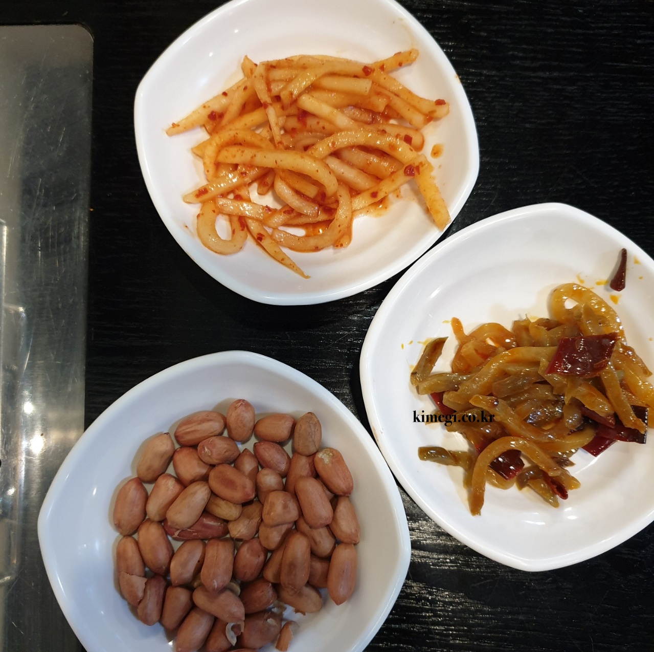 양꼬치를 주문하니 기본 반찬으로 무생채와 자차이, 땅콩이 나왔습니다. 무생채가 조금 특이했는데 정말 맛있었어요. 추가 주문해서 자차이보다 더 많이 먹었습니다. 양꼬치랑 정말 잘 어울리는 밑반찬이에요.
