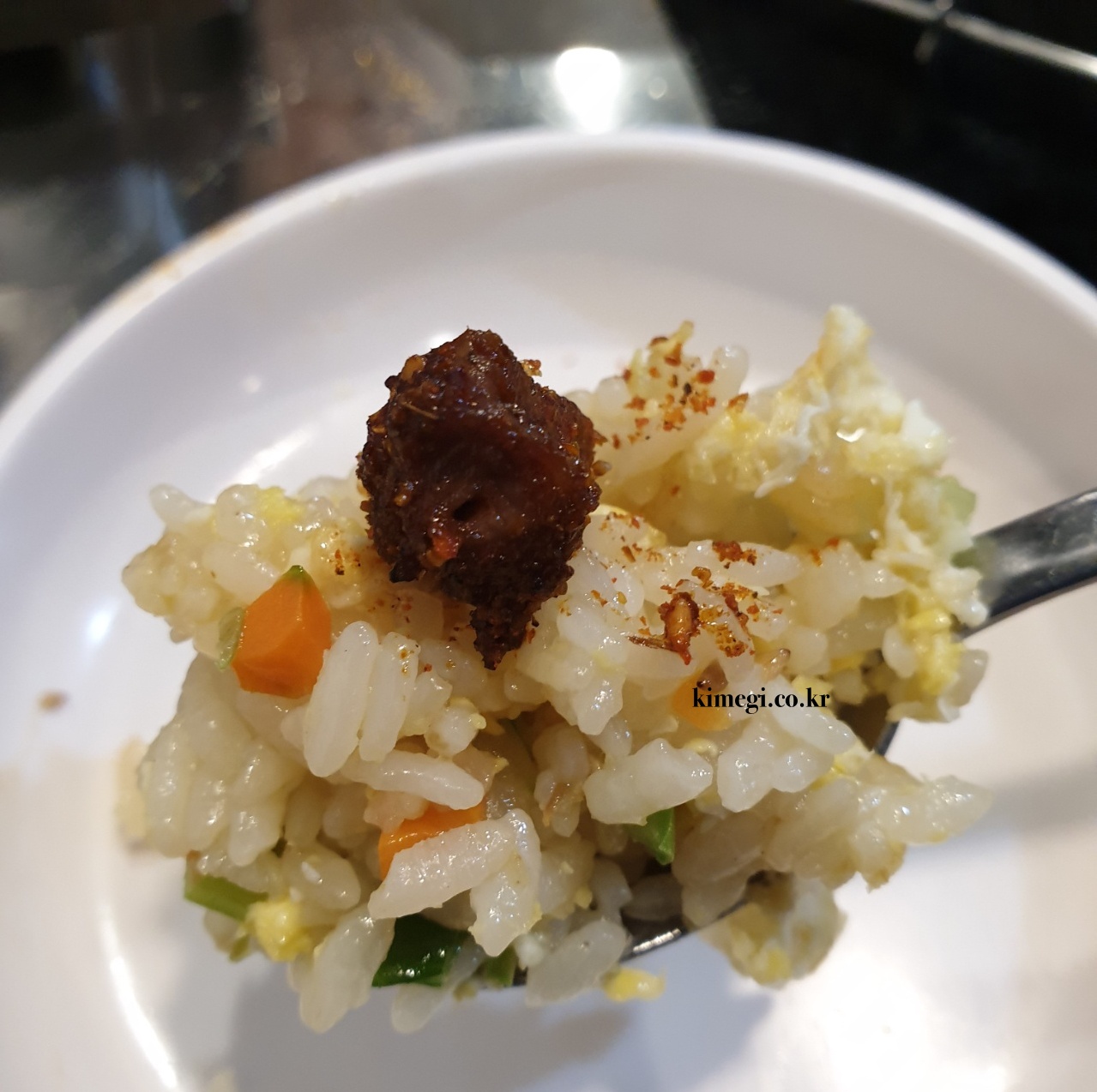 양꼬치와 함께 탄수화물을 꼭 먹어줘야 합니다. 항상 옥수수 면과 볶음밥 중에서 고민을 하는데 오늘은 볶음밥으로 선택했어요. 계란볶음밥을 선택한 것에 정말 만족했습니다. 기본만 들어갔는데도 간도 적당하고 양꼬치와 함께 먹기 딱 어울렸어요.
