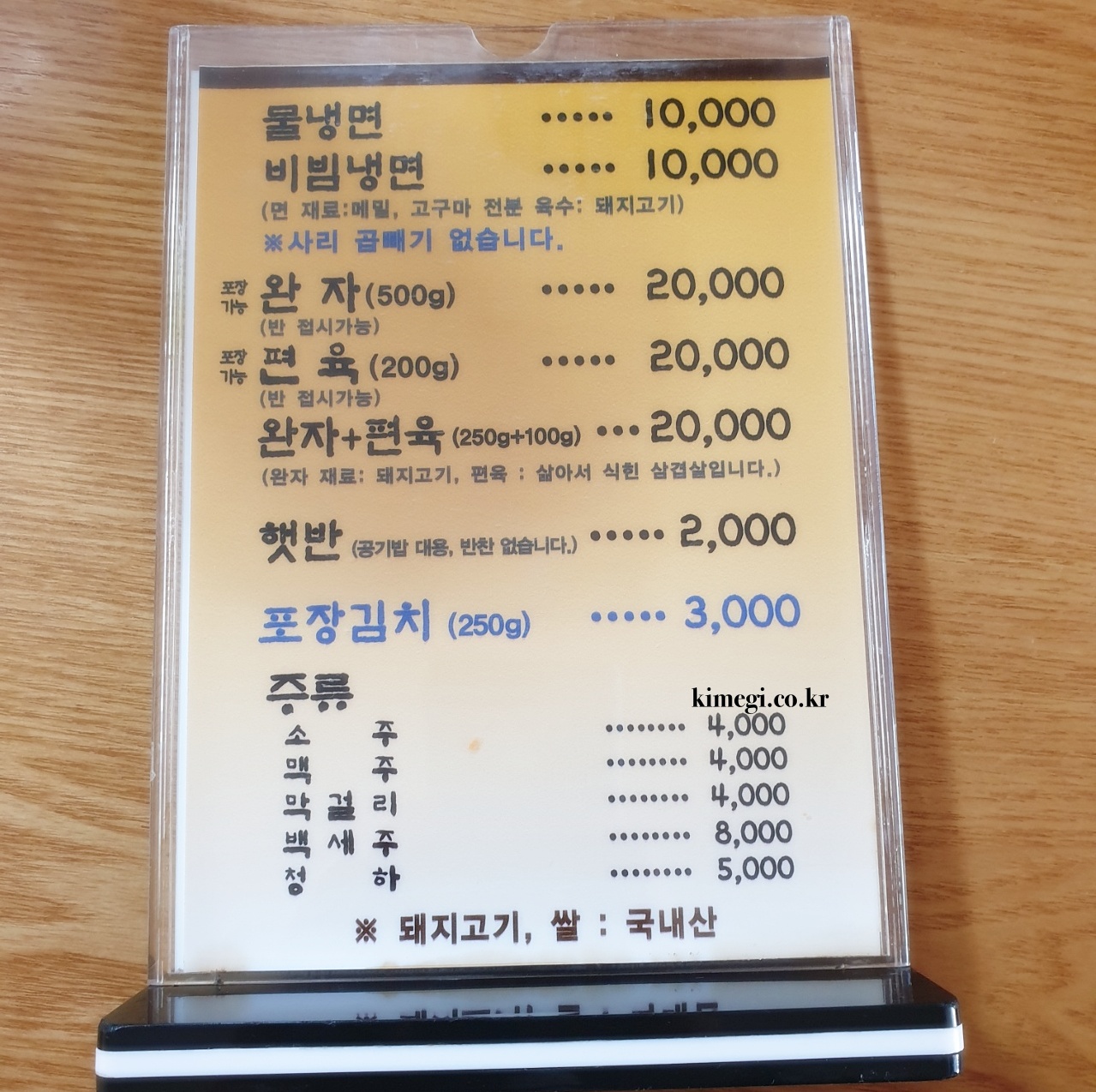 옥천냉면 메뉴판입니다. 물냉면과 비빔냉면이 기본이고 완자와 편육을 사이드로 먹을 수 있습니다. 반 접시도 가능하다고 하네요. 저희는 함흥냉면에 길들여져 있어 평양냉면의 슴슴함을 아직 잘 몰라요. 그래서 다들 비빔냉면으로 주문했습니다. 아침이라 사이드는 주문하지 않았어요. 지금 생각해보면 완자를 주문할 걸 그랬습니다.
