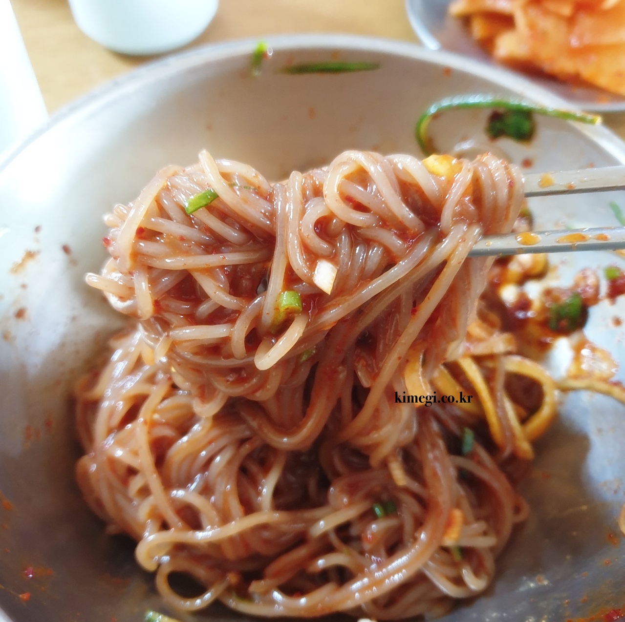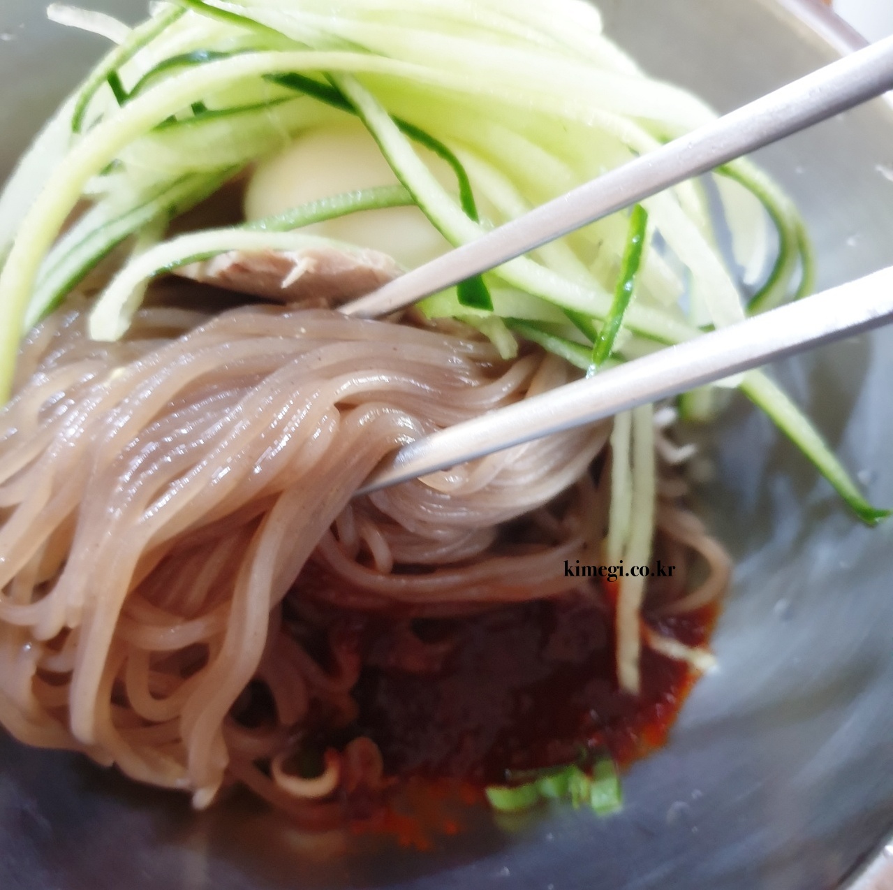 두꺼운 매 밀면에 오이와 계란을 고명으로 한 비빔냉면이 나왔습니다. 한눈에도 매밀면의 쫄깃하고 탱글한 면발이 느껴집니다. 유민상 형도 면발을 먹고 쫄냉면이라고 할 정도로 면이 쫄깃쫄깃했어요. 옥천냉면은 면발이 가장 주력 무기인 것 같아요.
