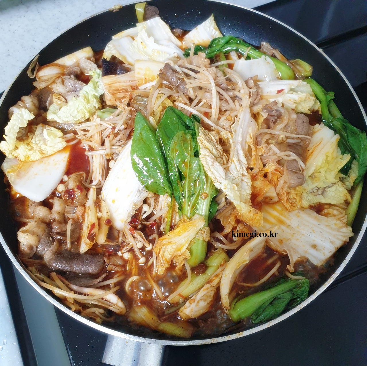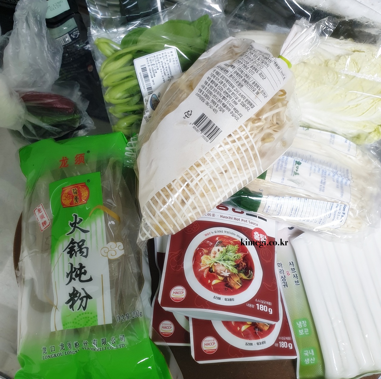 준비물 : 마라탕 소스, 중국 당면, 분모자, 고기, 해산물, 청경채, 숙주, 팽이버섯, 알배추, 고추