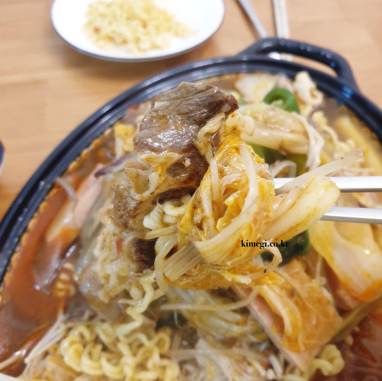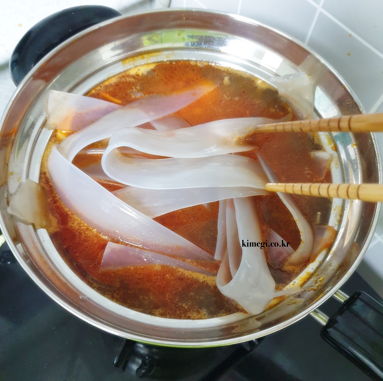 더 큰 냄비로 옮겨준 다음에 햄과 오징어, 당면, 분모자를 넣어줍니다. 소시지, 만두, 옥수수 면 등 어떤 것을 넣어도 마라탕의 향이 베어서 정말 맛있습니다. 저는 라면을 넣어주었어요. 항상 실수하는 것이 양 조절입니다. 이것도 넣고 저것도 넣다 보니 냄비가 넘칠 것 같더라고요. 그래서 밥을 같이 먹으려다가 밥은 포기했어요.