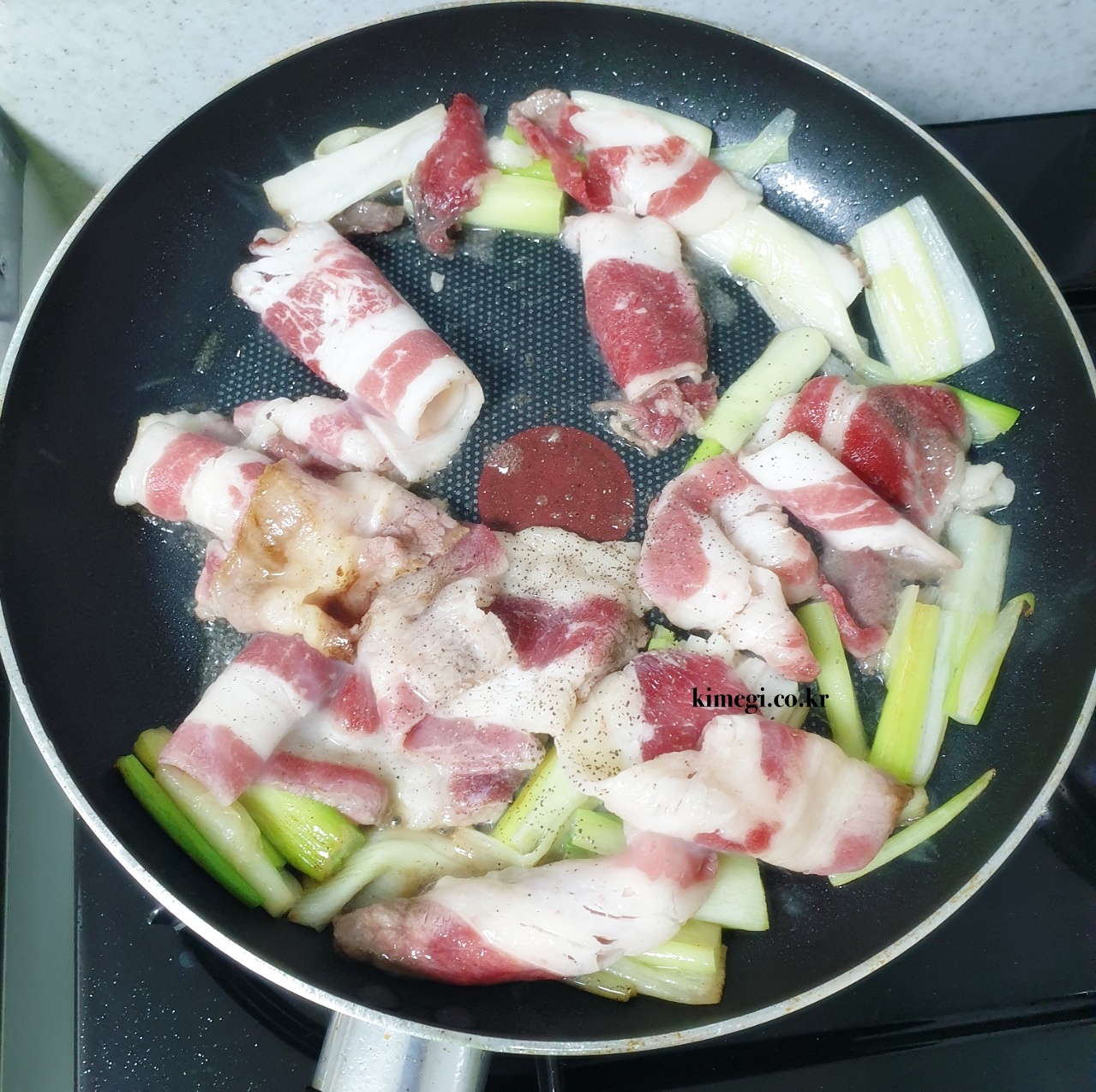 그냥 마라탕 육수를 만들어서 다 넣고 끓여도 되지만 조금 더 맛있게 해 주기 위해서 먼저 볶아 주었어요. 냉동고에 있던 대패삼겹살과 파를 볶아서 기름을 내준 다음 야채들을 넣고 같이 볶아 줍니다. 돼지기름에 볶아진 야채가 더 맛있어집니다.