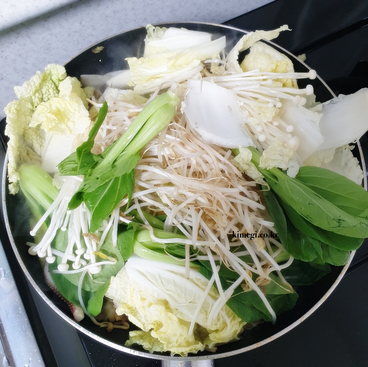 배추와 청경채, 팽이버섯, 숙주도 잘 씻어서 손질을 해줍니다. 야채는 집에 남아있는 아무 야채나 넣어주면 됩니다. 마라탕을 만들어 먹으면 좋은 점이 집에 남는 야채를 처리할 수 있기 때문이에요. 야채뿐만 아니라 먹다 남은 스팸과 냉동고 구석에서 잠자고 있던 오징어까지 손질해 주었습니다. 남은 재료들 다 넣고 끓이면 맛있는 마라탕이 됩니다.