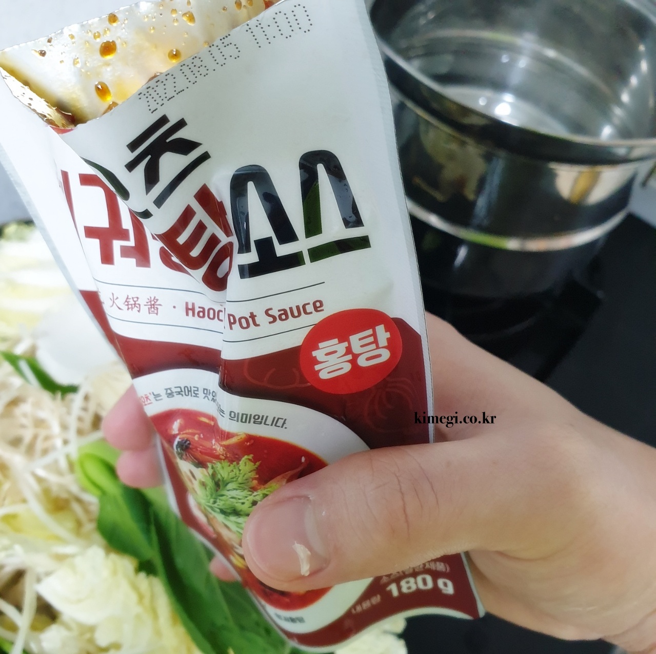 마라탕 소스를 열자마자 매콤한 향신료 냄새가 나네요. 마라탕을 성인이 돼서 처음 먹어봤는데 너무 맛있더라고요.
