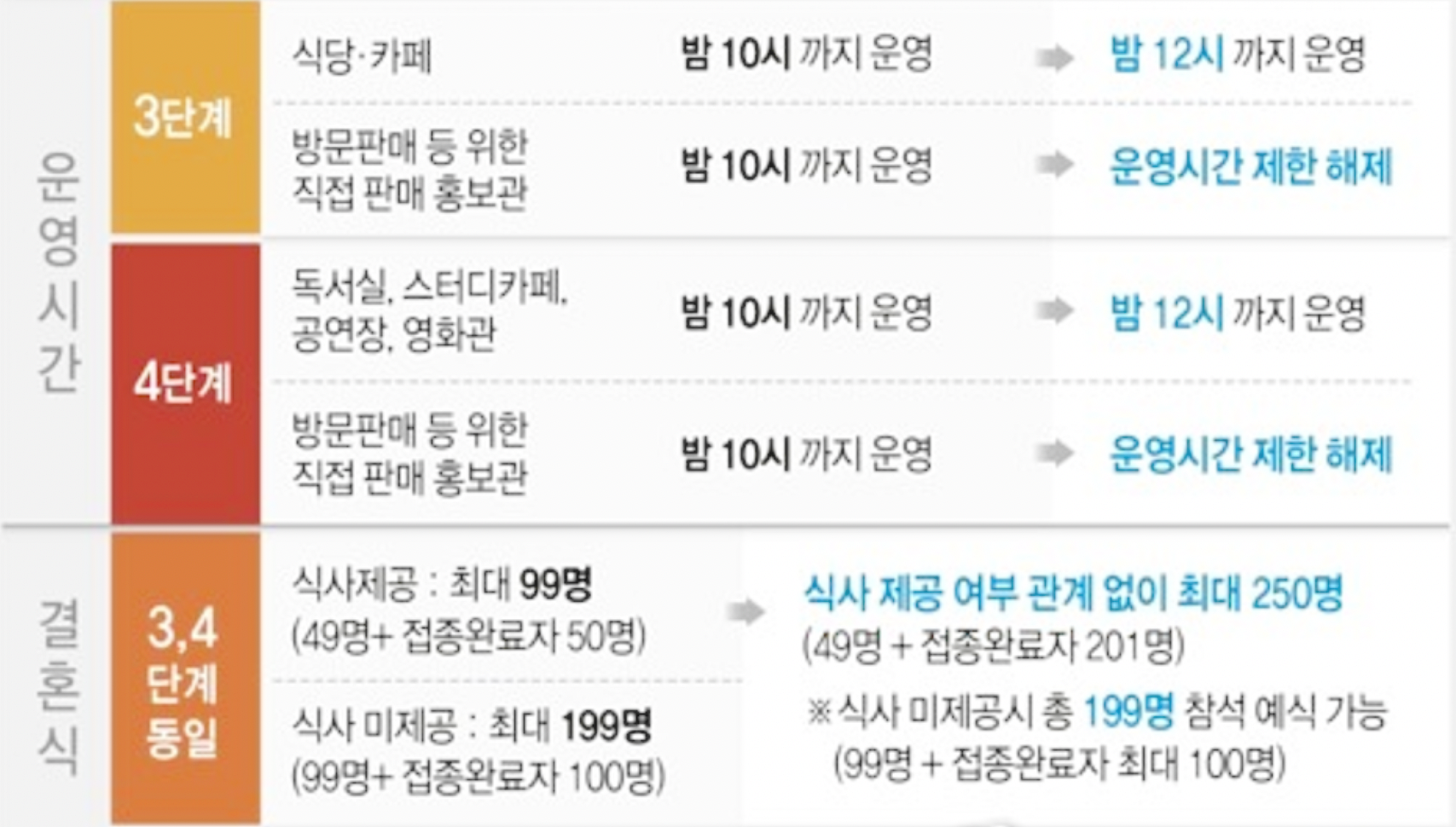 인원 뿐만 아니라 영업시간도 연장됩니다. 기존에는 22시까지 운영 가능했던 식당, 카페가 00시 자정까지 2시간 연장된다고 합니다. 그동안 미뤄놓았던 모임들을 할 수 있게 된 것 같아요. 특히, 결혼식 관련 코로나 인원제한도 많이 완화가 되었습니다. 코로나로 결혼식을 연기한 당사자로 관심이 가는 항목입니다. 식사 제공 여부와 관계없이 최대 250명까지 가능합니다. 기존 49명에서 접종 완료자 201명 까지 추가된다고 하니 슬슬 다시 결혼식 준비를 해봐야겠네요.