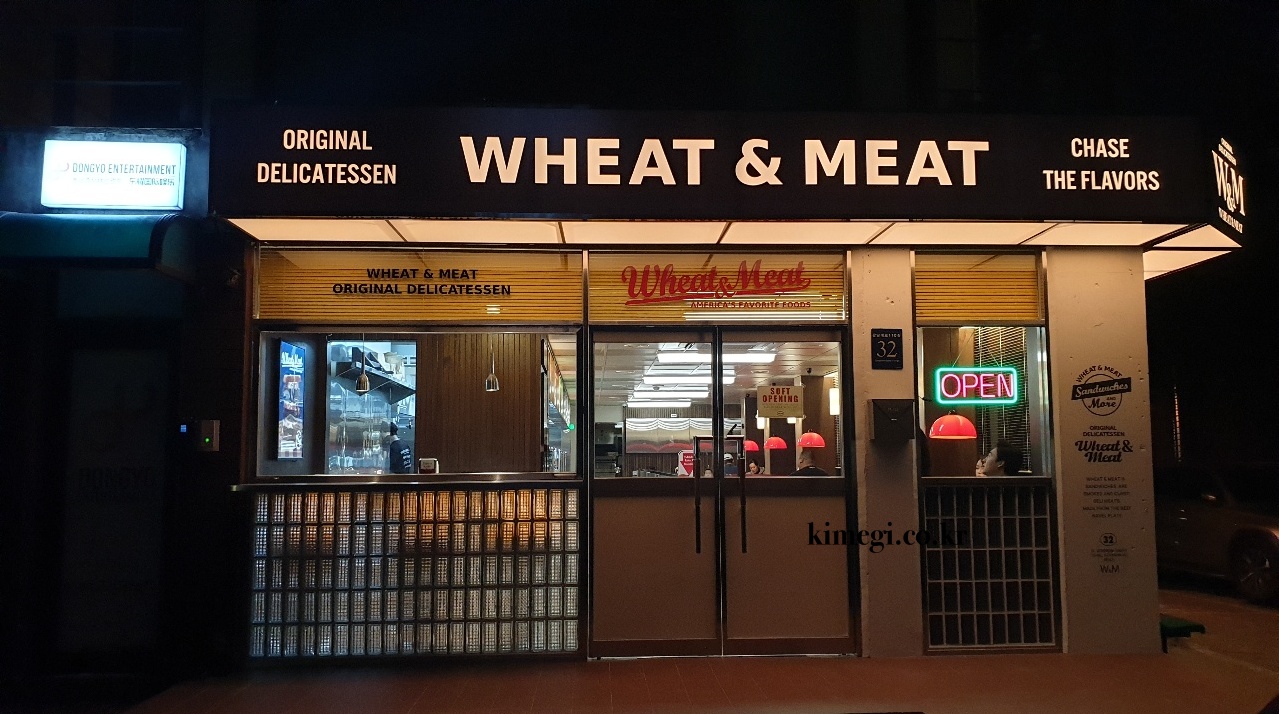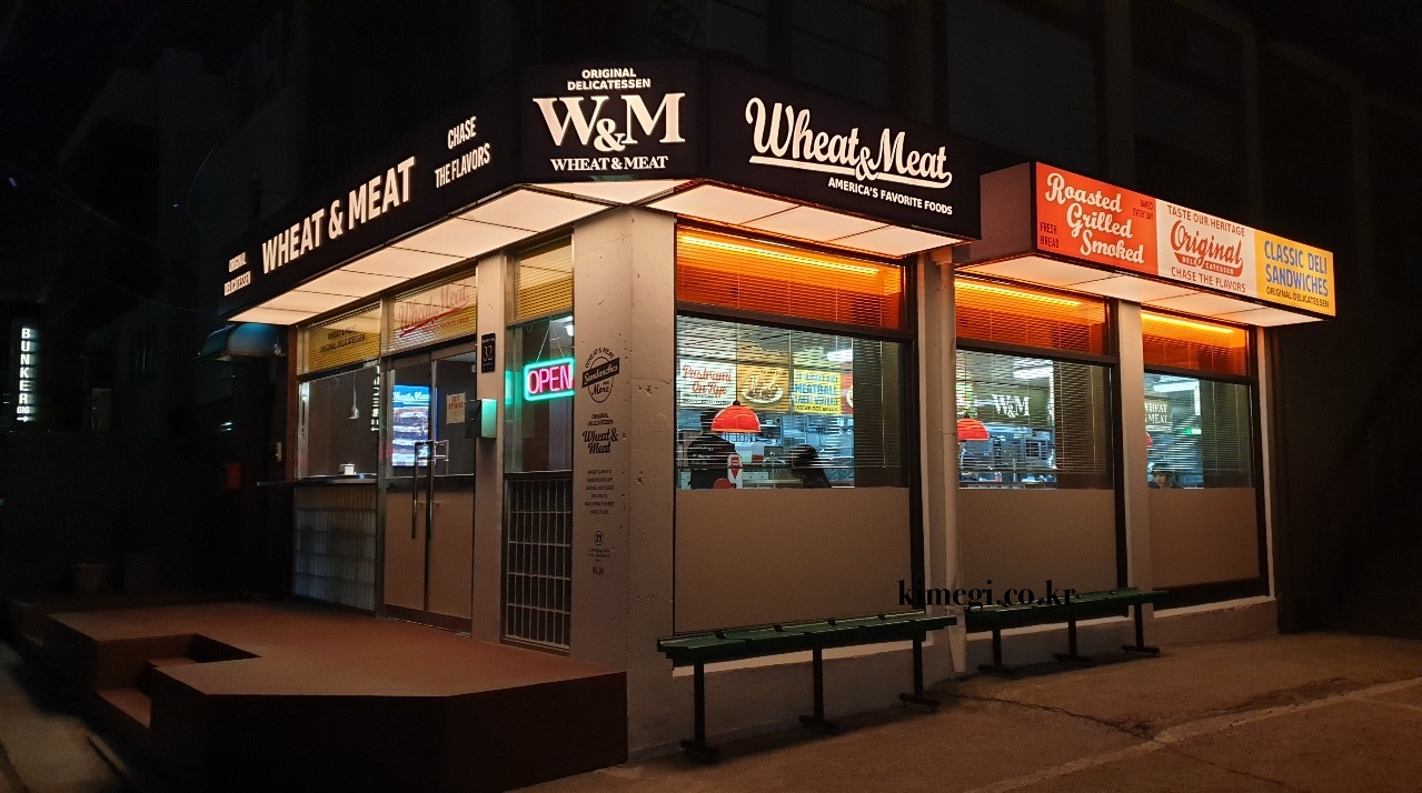 강남에 미국식 샌드위치 음식점이 새로 생겼다고 해서 방문해보았어요. 해외여행을 못가는 요즘 맛집을 찾을 때 외국느낌이 나는 곳으로 찾게되요. 신논현역에 가까운 위트앤미트는 외관 부터 미국느낌이 확 났습니다. 신논현의 메인 거리에서 한블럭 더 들어가면 나오는 곳인데 보자마자 여기가 미국인가 했어요. 미국 영화보면 밤에 자동차 타고가다가 중간에 음식점이 나오는 그런 느낌이였어요.