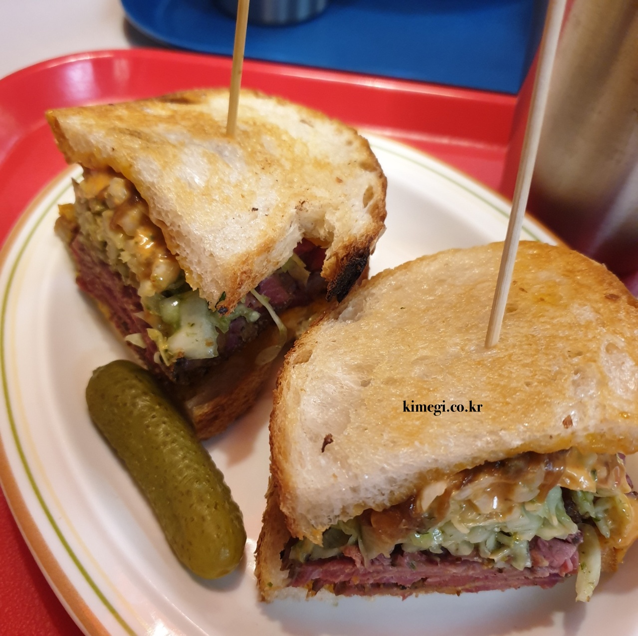 샌드위치는 손으로 들고 먹어야 하는데 살짝 들고 먹기는 불편했어요. 보기보다 사이즈가 정말 크거든요. 소스는 타르타르 베이스의 소스로 너무 맛있었어요. 아까 먹은 파스트라미 샌드위치 소스보다 더 맛있었어요. 고기는 파스트라미가 더 맛있었고요. 우열을 가릴 수 없는 샌드위치입니다.