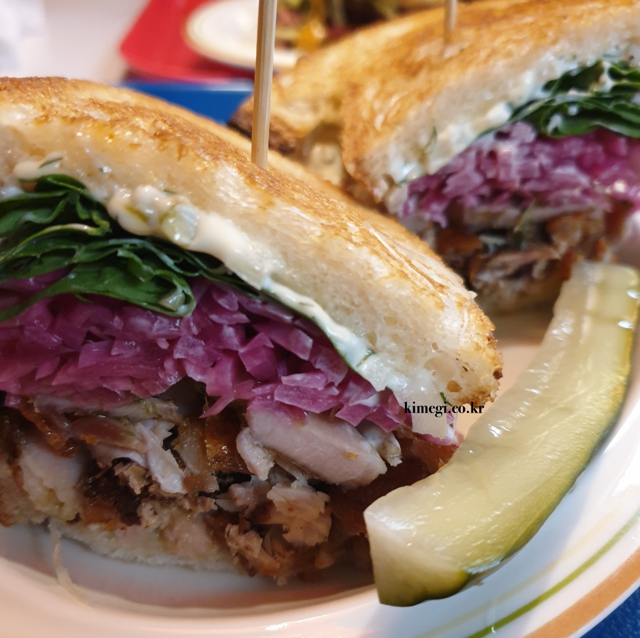 더 포르게타 샌드위치 입니다.(12,800원) 포르게타와 양파피클, 루꼴라가 들어간 샌드위치 입니다. 포르게타는 삽겹살을 크리스피하게 구운거라고 하네요. 그래서 그런지 고기가 정말 바삭바삭했어요. 바게트 빵도 바삭하고 고기도 바삭해서 식감이 정말 미쳤습니다. 너무 맛있어서 입천장 까지는 것도 모르고 먹었어요.