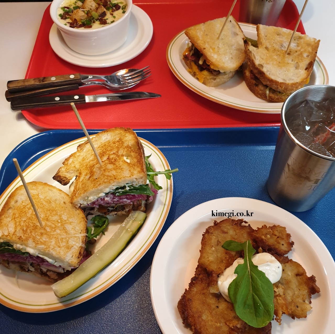 주문한 음식이 나왔습니다. 직접 만든 바게트 빵에 각종 채소와 고기가 들어간 샌드위치와 클램 차우더 스프, 감자랏커, 자몽에디드, 레몬에이드를 주문했어요. 샌드위치는 설명을 봐도 잘 모르겠어서 추천해 주는 것으로 주문했습니다.