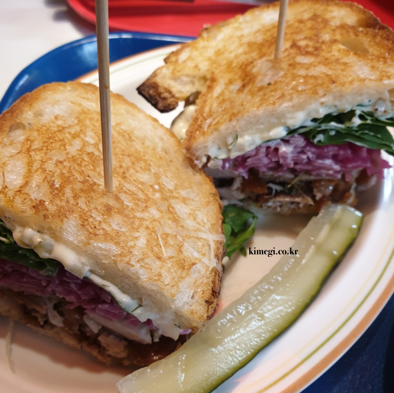 샌드위치는 손으로 들고 먹어야 하는데 살짝 들고 먹기는 불편했어요. 보기보다 사이즈가 정말 크거든요. 소스는 타르타르 베이스의 소스로 너무 맛있었어요. 아까 먹은 파스트라미 샌드위치 소스보다 더 맛있었어요. 고기는 파스트라미가 더 맛있었고요. 우열을 가릴 수 없는 샌드위치입니다.