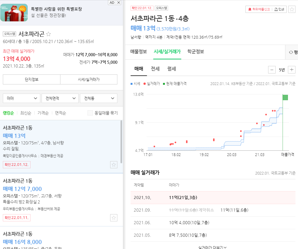비슷한 입지의 전용 75인 아파텔은 3년간 2배 이상의 가격 상승이 있었습니다. 아파트보다는 적은 상승이지만 상승기에 벼락 거지가 되지 않을 정도의 상승입니다. 만약 임대수익이 아닌 시세차익, 실거주를 위한 오피스텔 매매라면 큰 평수의 아파텔을 매매하는 것이 좋습니다.