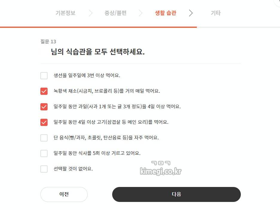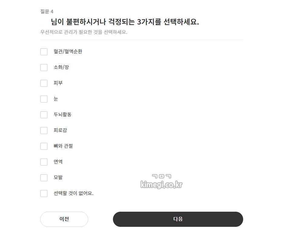 아래처럼 무료 설문을 진행하면 필요한 영양제와 영양제 정보를 자세하게 알려줍니다. 추천받은 모든 영양제를 먹기에는 너무 많아서 읽어보고 나에게 맞을 것 같은 영양제로 한번 더 추려준 다음 구매했습니다.
