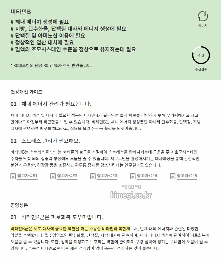 영양제마다 아래처럼 핵심 정보를 알려주어서 따로 찾아볼 필요가 없어요. 설문만으로는 완벽하게 파악이 어렵기 때문에 잘 읽어보고 최종 결정을 하면 좋을 것 같아요.