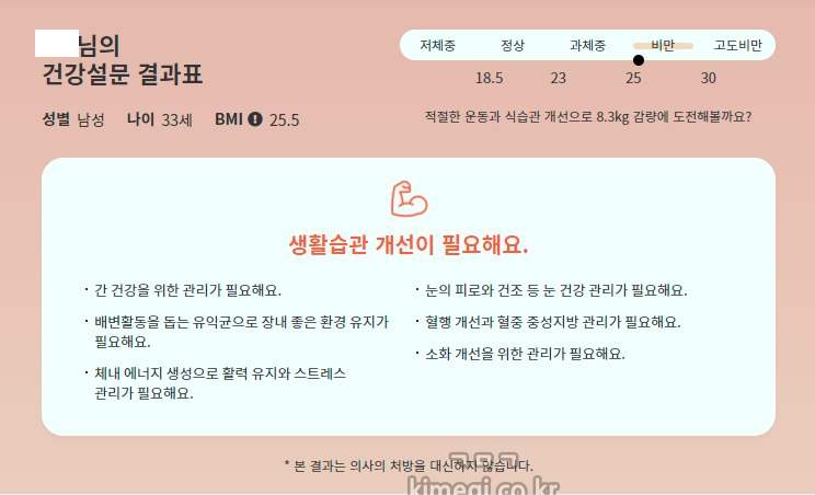 가볍게 건강 상태와 생활 개선 사항도 알려줍니다. 요즘 살이 많이 쪄서 비만인 것을 알고 있었지만 이렇게 눈으로 보는 것은 조금 충격입니다. 영양제도 챙겨 먹으면서 운동도 해야겠네요.